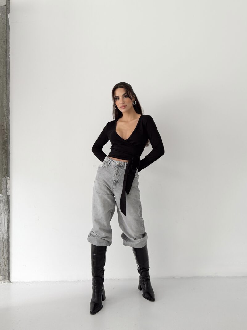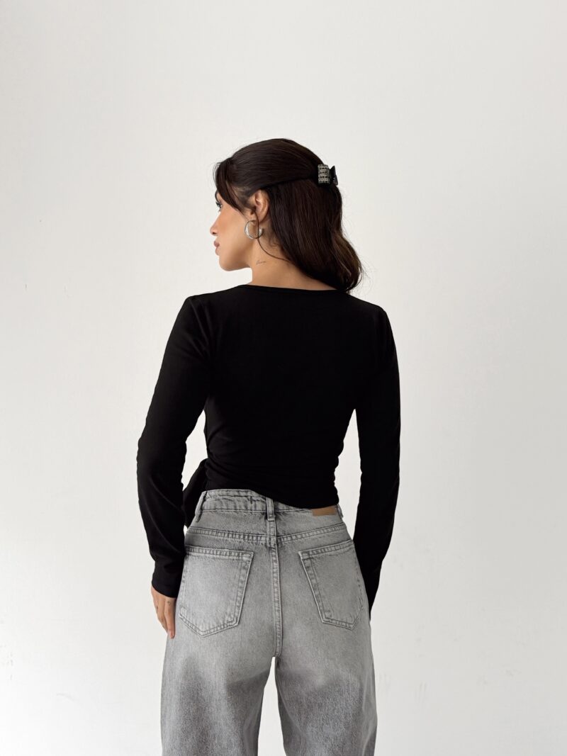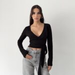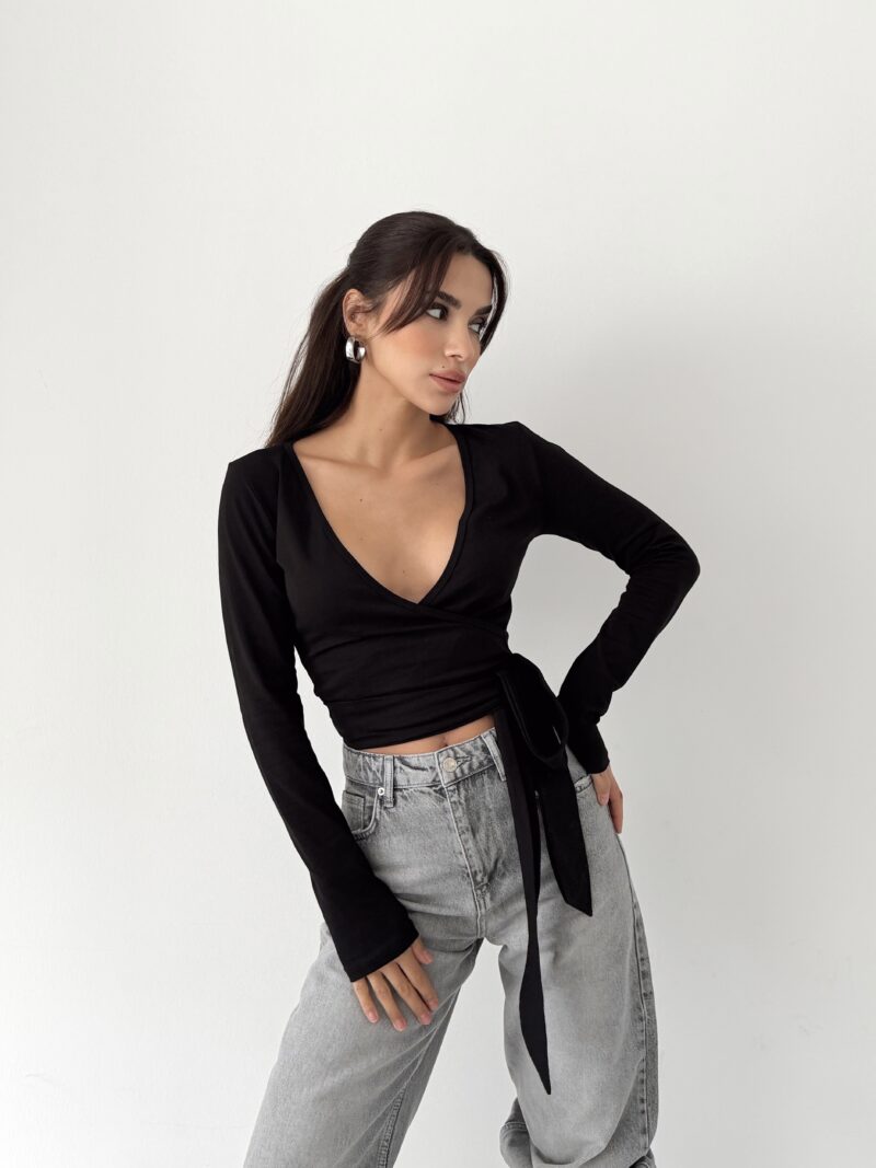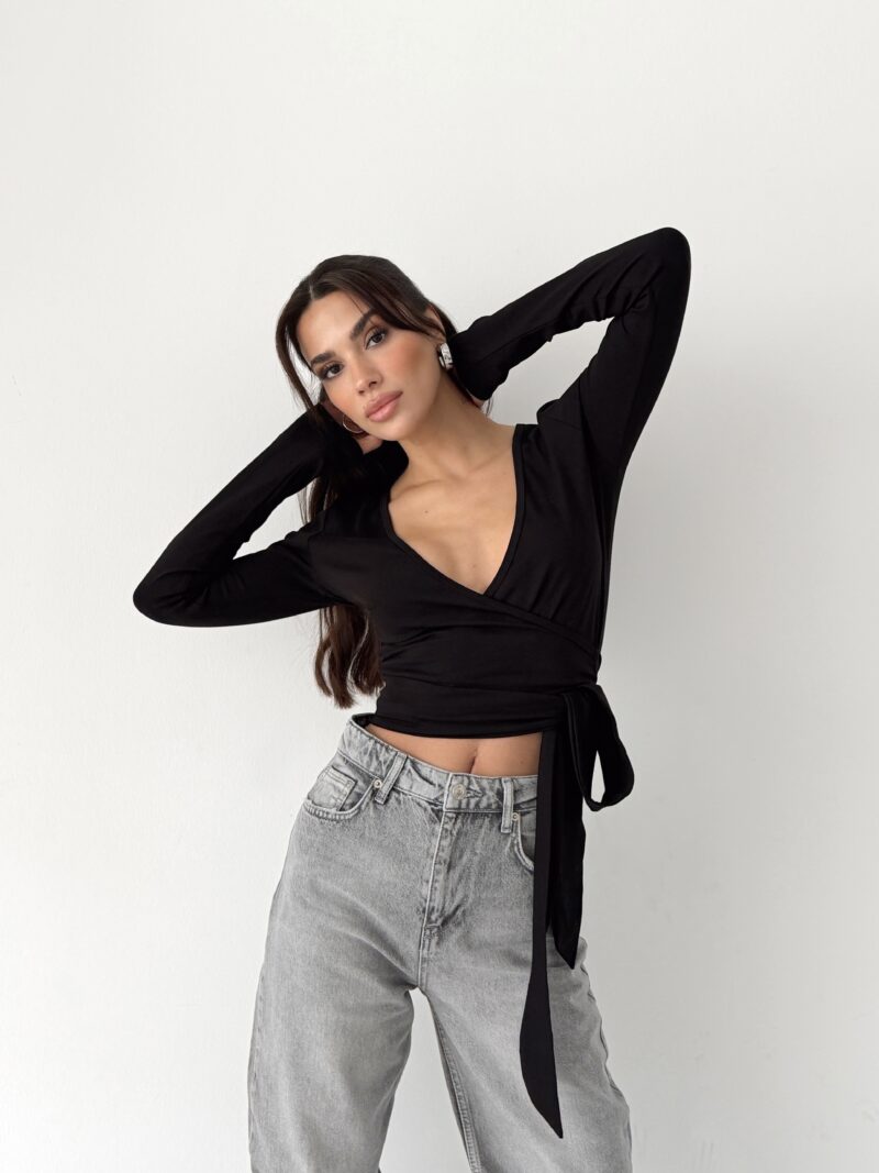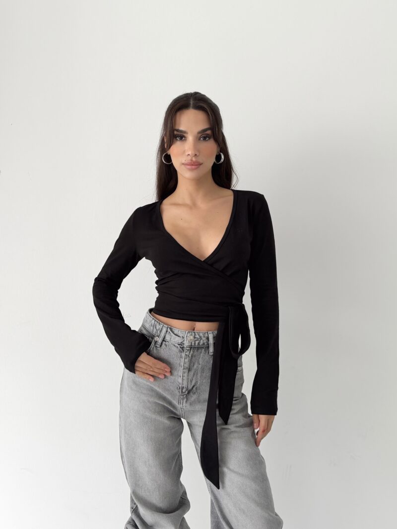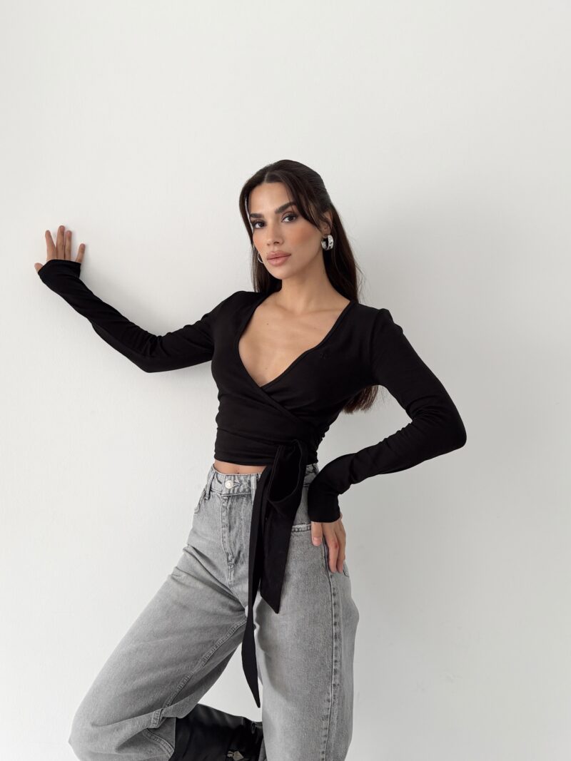 It offers a powerful and clear silhouette with its pure black tone and body-hugging wrap form. Its organic cotton content provides skin-friendly, natural, and comfortable wear. Its flexible structure offers a sense of free movement, accompanying the body all day long.